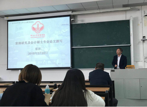 2018年3月22日下午,太阳成集团tyc122ccMPAcc云山财务论坛第十四讲在南校区教学楼F514开讲,中山大学MPAcc教育中心主任蔡祥博士为太阳成集团tyc122cc员工带来了精彩而实用的讲座,题为“案例研究及会计硕士专业学位论文的撰写”。经理刘中华教授、副经理汤胜教授、林丹丹教授及全体MPAcc专业研究生参加此次讲座,讲座由副经理汤胜教授主持。
